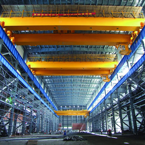 橋式起重機是架設(shè)在車間、倉庫、料場上方的提升設(shè)備,用于物料的吊運。因其兩端設(shè)在高高的水泥柱或金屬支架上,形似橋。橋機橋架沿兩側(cè)架設(shè)架軌縱向運行,可充分利用橋架下空間吊運物料,不受地面設(shè)備的干擾。這是目前應(yīng)用特別廣泛的一種起重機械。